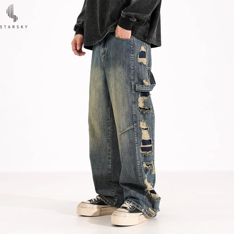 Herren Retro Straight Jeans Distressed Hole Camouflage Patch Loose Wide Leg Whole Sale Herren Custom Jeans